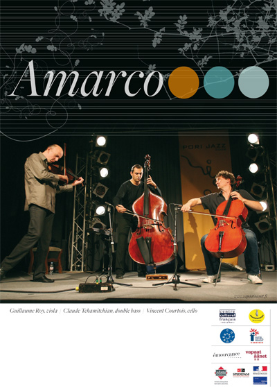 Harvinaislaatuinen kolmihenkinen jousisoitinperhe heittäytyy improvisoimaan tosi tarkoituksella. Asialla ranskalaiset alan huiput! Vuoden 2006 Claude Tchamitchianin perustettu yhtye on esiintynyt Pori Jazzin Ultra Music Nightsilla 2008. Tämän vaikuttavan ensiesityksen jälkeen Amarco palaa Suomeen tänä syksynä ja soittaa yhdentoista konserttia putkeen. Suomen jakson seuraa vielä viikko Baltiassa.
