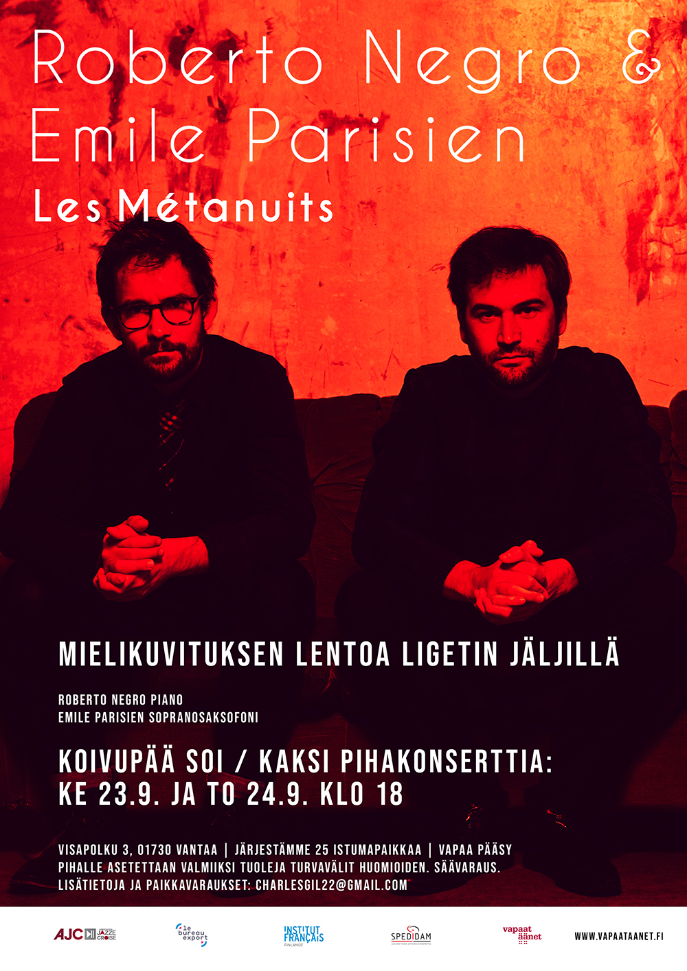 Syksyn 2020 Vapaat äänet -kiertue tuo lavoille Suomen ja Ranskan jazzkenttien kiehtovimpia ja ennakkoluulottomimpia muusikoita, kun rumpali Olavi Louhivuoren Superposition sekä pianisti Roberto Negron ja saksofonisti Emile Parisienin duo esiintyvät ympäri maata 22.9.-4.10. Ennen kiertueen varsinaista alkua ranskalais-italialaisduo pitää taiteilijanresidenssin Vantaan Koivupäässa 23. ja 24. syyskuuta. Molempina päivinä klo 18 kaksikko avaa harjoitussalin ikkunat yleisölle ja soittaa vajaan tunnin konsertin. Yleisö on tervetullut Visapolku 3 talon etupihalle nauttimaan huippukaksikon vuoropuhelusta. Duo esittää katkelmia Les Métanuits -ohjelmastaan ja antaa 1920-luvun täysin kunnostetun Steinway M-flyygelin ja Selmer-Série III sopraanosaksofonin soida täysipainosesti syysiltaan. Konserttiin on vapaa pääsy.